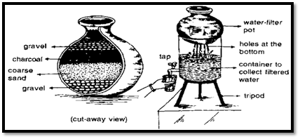 i. Charcoal filter: In this system, three pots are required. Begin by taking one pot and placing a mixture of pebbles, sand, and charcoal to create a filter. Set this filter on top of the second receptacle, making sure to create a hole at the bottom of the first receptacle. To use the system, pour water into the top filter. The water will pass through the layers of pebbles, sand, and charcoal, and the purified water can then be collected from the bottom receptacle, providing a reliable method for obtaining drinking water.