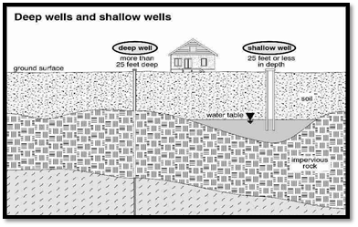 a. Shallow wells: These wells tap into the topmost subsoil water, located above the first impervious layer in the ground. Shallow wells are susceptible to pollution from nearby sources such as latrines, drains, soakage pits, cesspools, and manure collection.